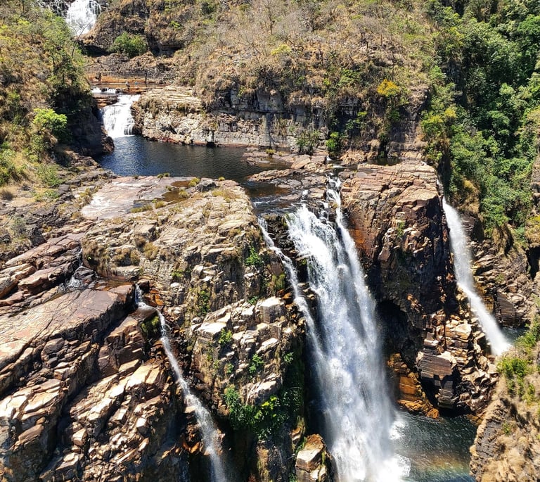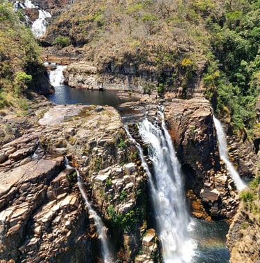Três cachoeiras espetaculares, cada uma com sua própria beleza. Oferecendo diversas opções de trilhas e pontos de banho, estas cachoeiras são destinos populares entre os visitantes da Chapada dos Veadeiros. As águas claras e refrescantes, combinadas com as paisagens, tornam estas cachoeiras locais perfeitos para aventuras e momentos de relaxamento.
