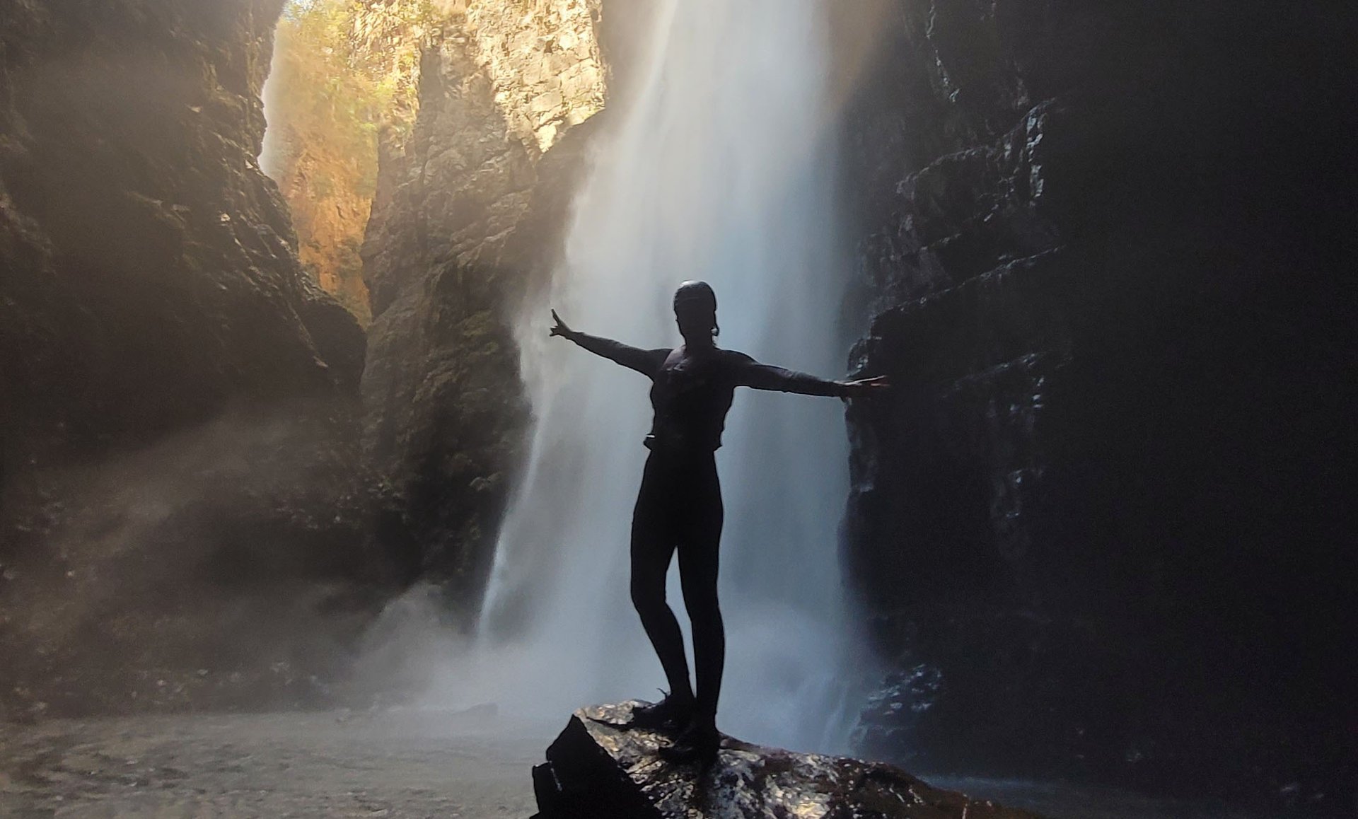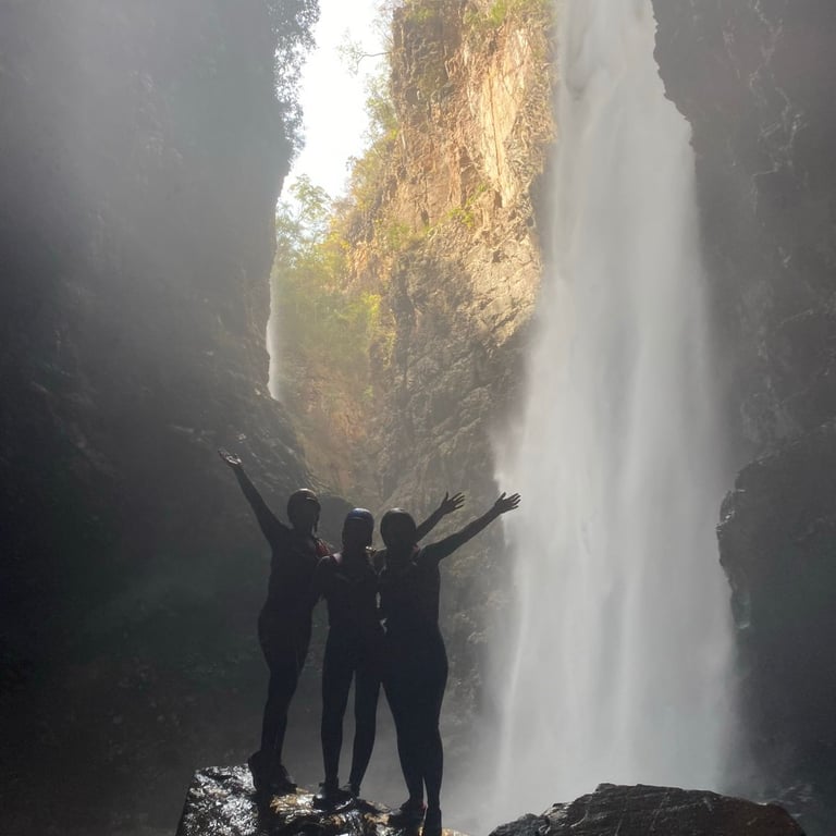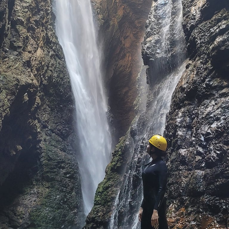 O Percurso: A imersão começa com uma descida tranquila de 25 minutos, um convite para se aclimatar e sentir a energia do lugar. Logo após chegamos a uma casa de apoio onde deixamos nossas roupas secas e mochilas e se equipamos para a parte aquática. A partir deste ponto a trilha se transforma em uma caminhada que transpassa pelo próprio leito do rio. São sete passagens que te conectam diretamente com a força das águas, uma experiência sensorial única que prepara o corpo e a mente para o que está por vir.