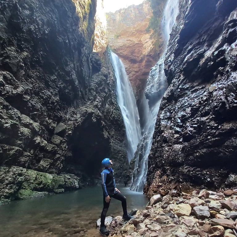 São 500 metros flutuação de por dois cânions grandiosos. Para garantir sua total segurança e tranquilidade neste trecho, o uso de capacete é obrigatório, protegendo contra o risco de queda de pedras e permitindo que sua única preocupação seja a contemplação. É um momento de se deixar levar pelas águas cristalinas, celebrar e sentir a força da natureza até alcançar o prêmio final: duas cachoeiras espetaculares, perfeitas para um banho revigorante.