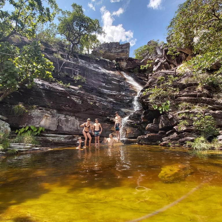 Passeios aquáticos: Vivencie hidromassagens naturais, cachoeiras incríveis, tobogãs e poços cristalinos na Chapada dos Veadeiros.